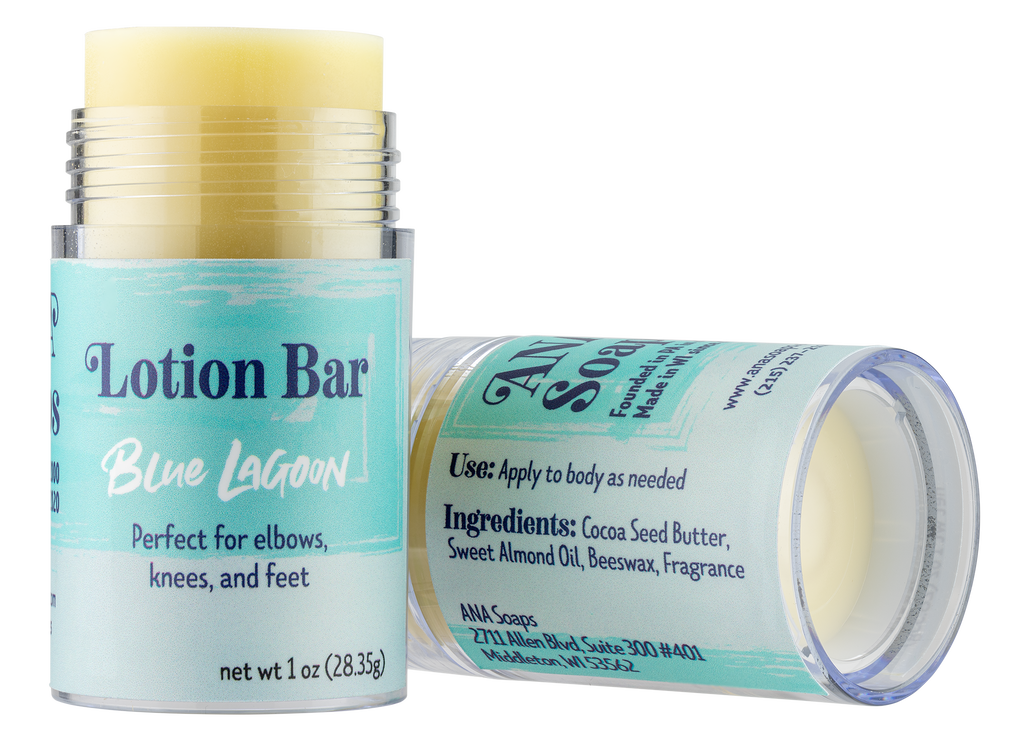 Lotion bars are push up tubes filled with cocoa butter and sweet almond oil. This combination glides right on, soaks right in, and is non-greasy. Great for spots like elbows, knees, and feet. Net weight 1 ounce.