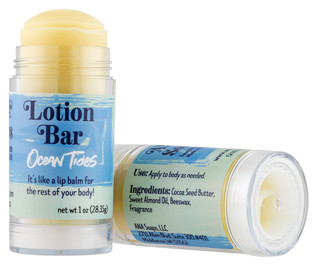 Lotion bars are twist up tubes filled with cocoa butter and sweet almond oil. This combination glides right on, soaks right in, and is non-greasy. Great for spots like elbows, knees, and feet. Net weight 1 ounce.