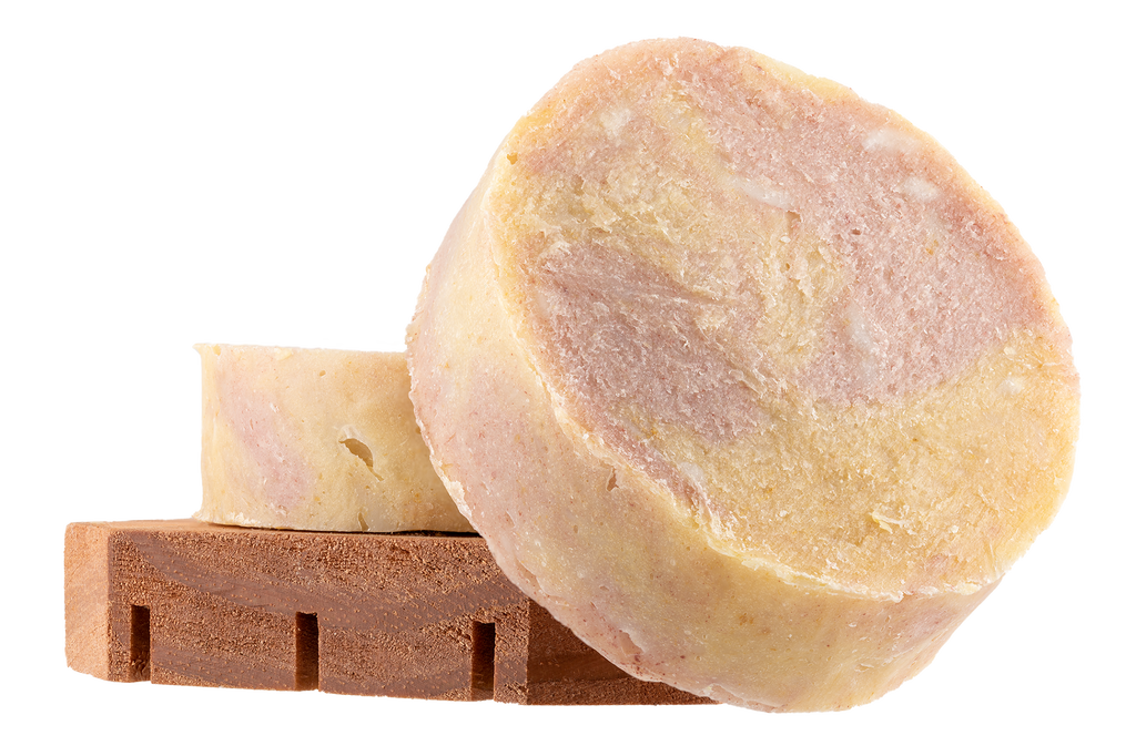 Ingredients: Soap (palm oil, coconut oil, soybean oil, water, sodium hydroxide), Milk, Iron Oxides (Yellow), Brazilian Red Clay (Kaolinite, Montmorillonite, Mica), Fragrance